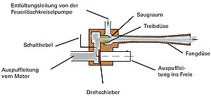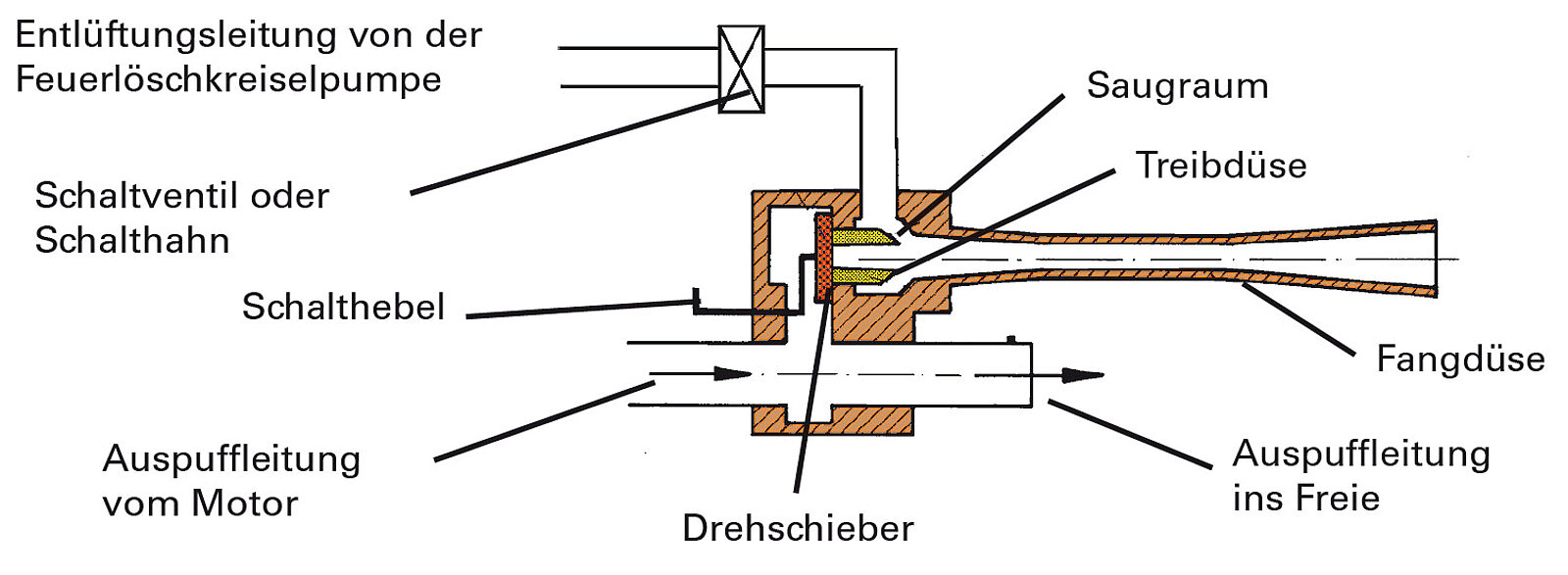 • Über die Verbindungsleitung mit der Feuerlöschkreiselpumpe strömt die Luft aus der Kreiselpumpe und der Saugleitung nach, bis aus dem Ausstoßrohr Wasser austritt. Die beste Leistung wird bei ca. drei Viertel der Höchstdrehzahl erreicht