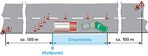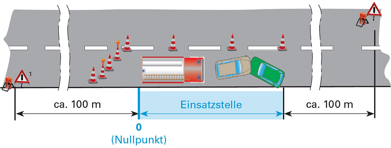 - Vorwarnung der Verkehrsteilnehmer beidseitig mit ca. 100 m Abstand zur Einsatzstelle und zum letzten Feuerwehrfahrzeug