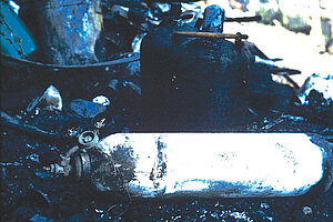 • Bei noch nicht stark erwärmten Acetylenflaschen, sind diese 30 Minuten aus der Deckung (Sicherheitsabstand) zunächst mit starkem, später mit sanftem Sprühstrahl zu kühlen. Bleibt die Flasche danach kühl (Kühlen einstellen, prüfen, ob der Flaschen­mantel schnell trocken wird), das Kühlen für 5 bis 10 Minuten einstellen. Bleibt die Flasche immer noch kalt, kann sie geborgen und in ein Wasserbad gelegt werden.