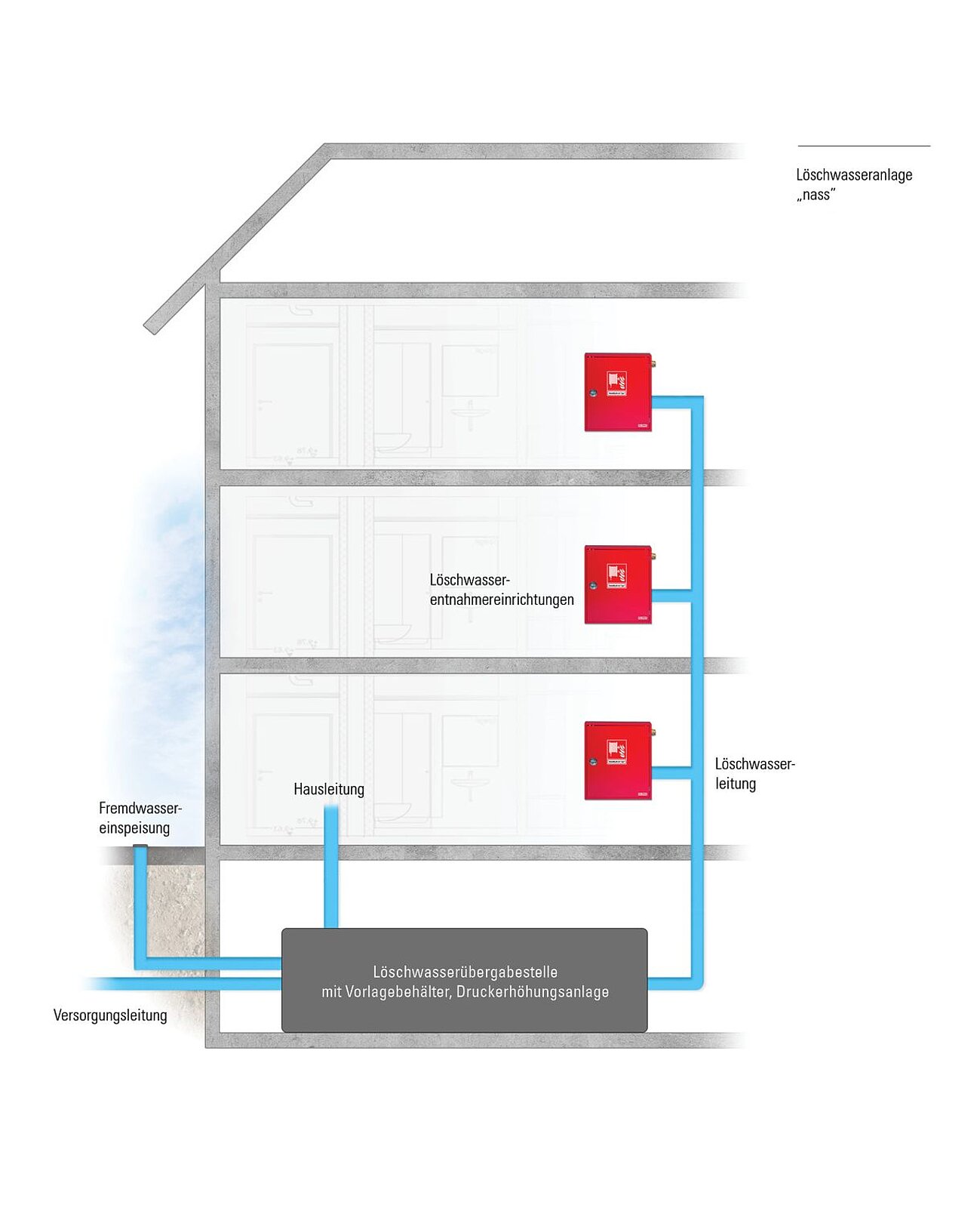 (Löschwasseranlage, Löschwassereinrichtungen, Steigleitung, Steigleitung „nass“, Steigleitung „nass / trocken“, Löschwasserleitung, Wandhydrant)