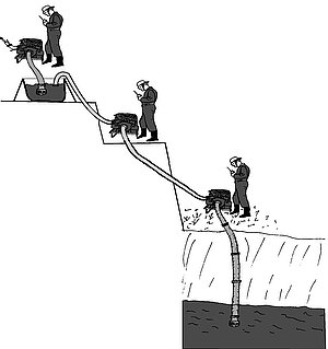 Die Förderstrecke ist an mindestens einer Stelle unterbrochen, z. B. durch einen Faltbehälter, der als Puffer eingebaut ist. Der Behälter wird vorzugsweise vor der letzten Pumpe (Strahlrohrstrecke) platziert. Der Einbau von Druckbegrenzungsventil und Verteiler vor dem Behälter ist notwendig, um den Wasserstand im Behälter regulieren zu können. Der Förderstrom sollte während des Betriebes konstant gehalten und ein freier Auslauf vermieden werden.