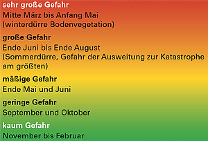 Die Waldbrandgefahr ist stark von der Jahreszeit abhängig (siehe Bild). Mit zunehmendem Niederschlagsmangel können sich jahreszeitliche Verschiebungen ergeben.