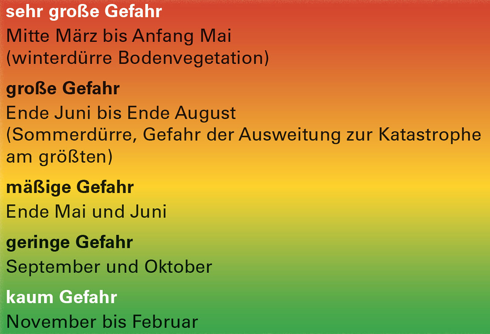 Die Waldbrandgefahr kann hier saisonale oder witterungsabhängige Spitzen aufweisen oder durch Veranstaltungen (z. B. „Waldfest”) ausgelöst werden.