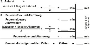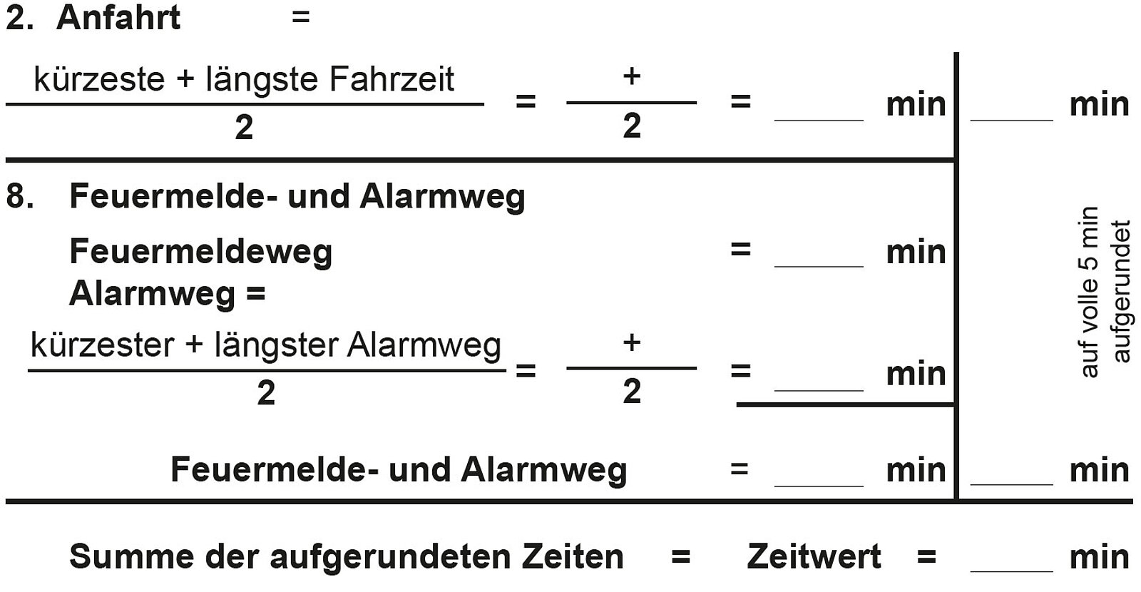 Für die Bestimmung der Richtwerte des Kräftebedarfs ergibt er sich aus den Punkten 2 (Anfahrt) und 8 (Feuermelde- und Alarmweg) des Ermittlungsblatts.